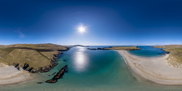 Three applications are used in the panorama creation workflow: Adobe Lightroom Classic is used for developing the raw images; PTGui Pro is used to create the panorama for the aerial and ground shots, this is a great application that has a range of tools to create a perfect image. Once the sky and ground panoramas are complete they are exported s 16bit TIFF files to retain all the colour and tone information for further processing without degrading image quality. The third application is Adobe Photoshop CC, this is used to blend the two panoramas together, a layer mask is used with a gradient that merges the two together. Colour matching is done with the sky at this stage, so it matches perfectly with the aerial shot. The offset filter is used to align the sun, then the two layers are merged. The dodge tool is used to darken the ground 180° from the sun, shooting with the sun directly behind creates a halo effect with a bright patch on the ground.