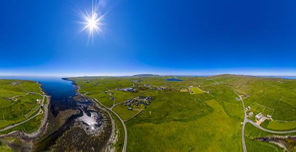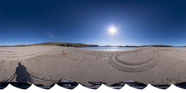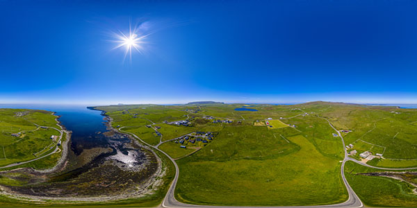 The process is repeated with the eight sky images shot in raw from the ground, and resized to the same horizontal dimensions as the aerial image. The two images are then colour matched and blended together in Adobe Photoshop to produce a full 360° by 180° image.