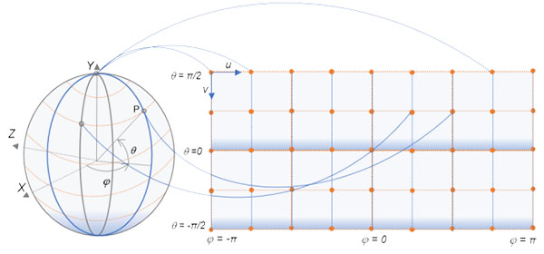 The 2:1 image can be projected in different ways (as shown on the Maps and Views page), use the scene context menu to explore the various projections.